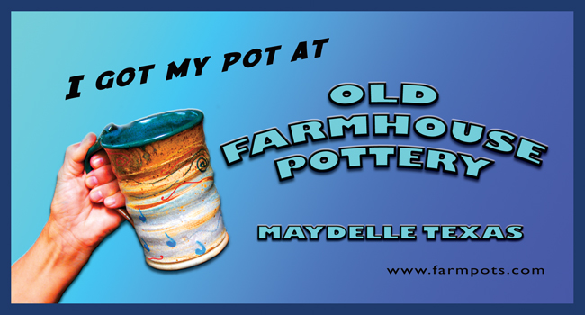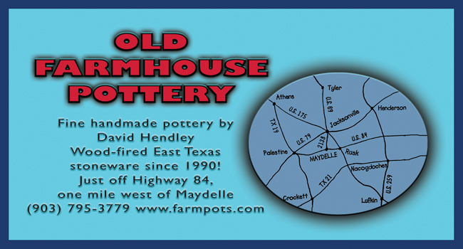 Welcome to Old Farmhouse Pottery at farmpots.com. We hope you enjoy looking around and will be able to visit in person some day. We are located in East Texas, between Tyler and Lufkin/Nacogdoches, or approximately halfway between Dallas and Houston. |